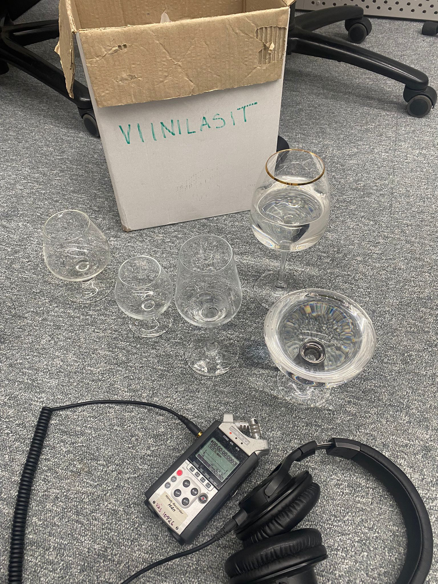 Viinilasit olivat esityksessä mukana vahvana elementtinä. Oli kiinnostavaa tutkia äänisuunnittelua, jossa näyttelijät osallistuvat kuljettamaan yhtä äänellistä elementtiä.